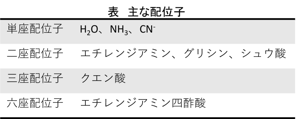 この配位原子が一つのものを単座配位子、二つ以上の配位原子を持つ配位子は、まとめて多座配位子と呼ばれるほかに、二座配位子、三座配位子などと、呼ばれることもあります。